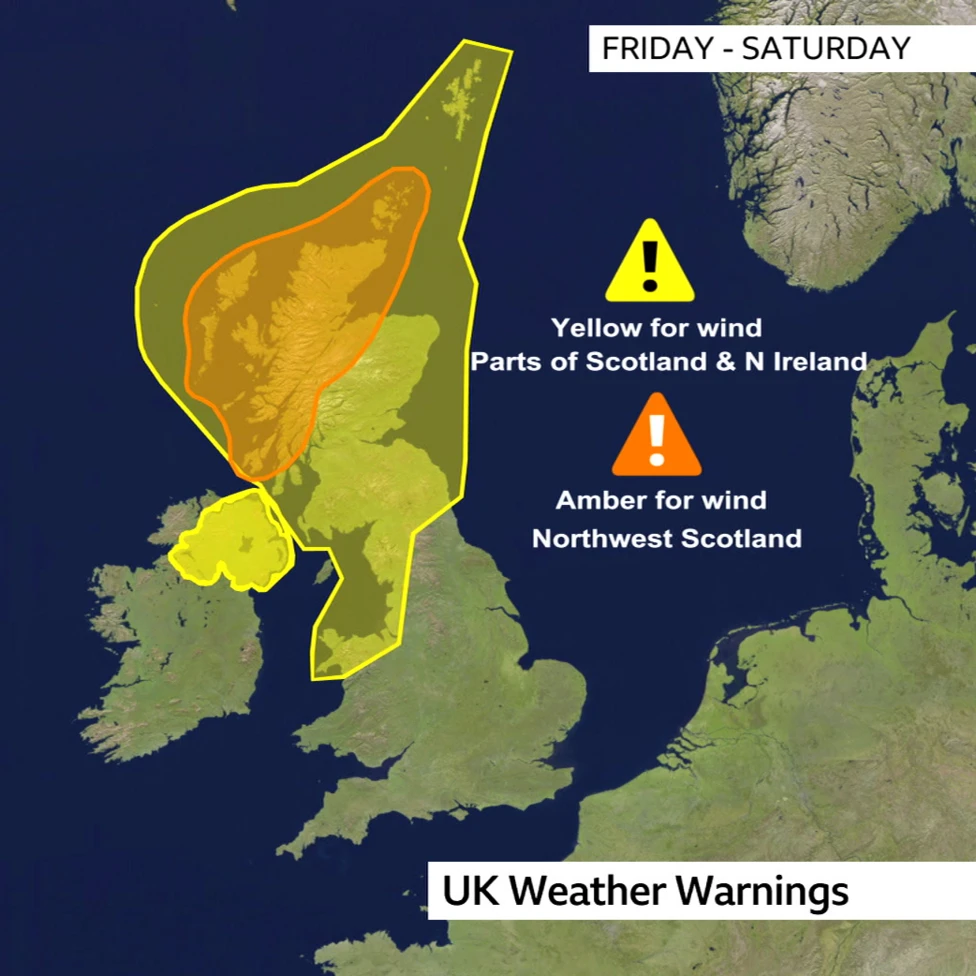 There are both rain and wind yellow warnings (be aware), but the amber warning (take action) is now north of Glasgow on Friday evening, and north of Inverness on Saturday.